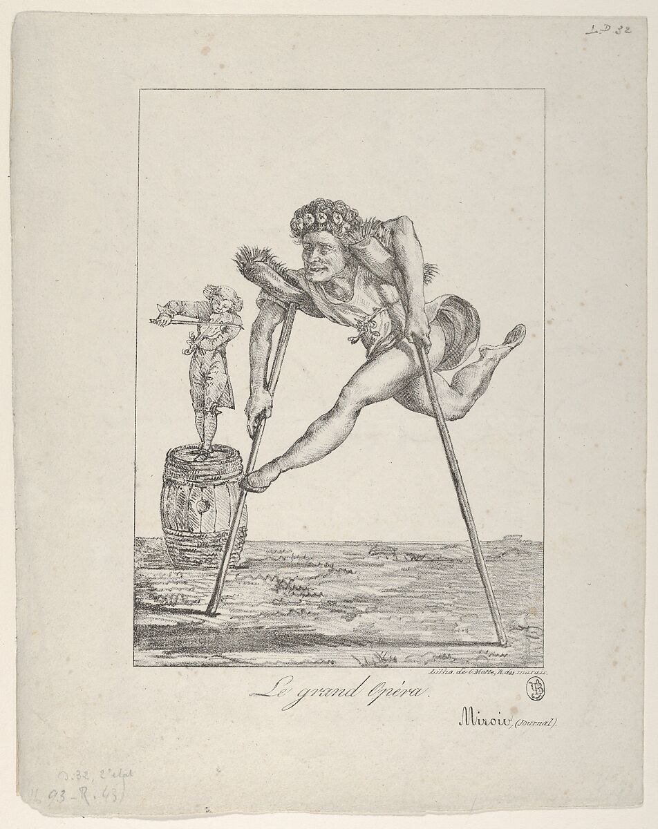 Published in the new liberal daily "Le Miroir," this satirical lithograph shows an aging former star in a classical tunic hobbling along on crutches, his infirmity suggesting the decline of Le Grand Opéra.