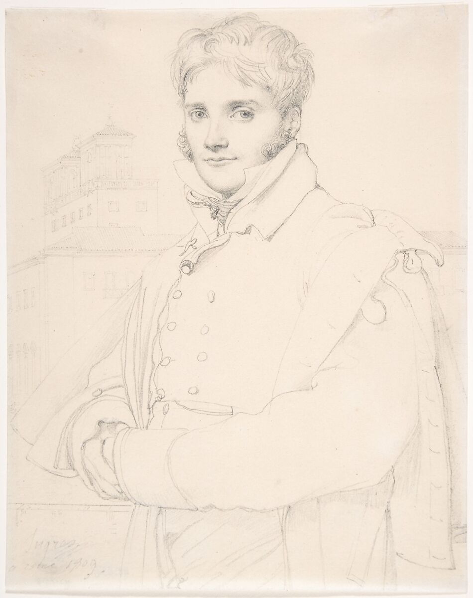 Ingres made this portrait of Merry Joseph Blondel, his fellow Prix de Rome winner, the year Blondel arrived in Rome. The Villa Medici, where the two artists resided and studied, appears in the background of the drawing. Although they trained with rival teachers—Blondel with Jean-Baptiste Regnault and Ingres with Jacques Louis David—and continued to compete for positions and honors throughout their careers, the two artists developed a lifelong friendship.