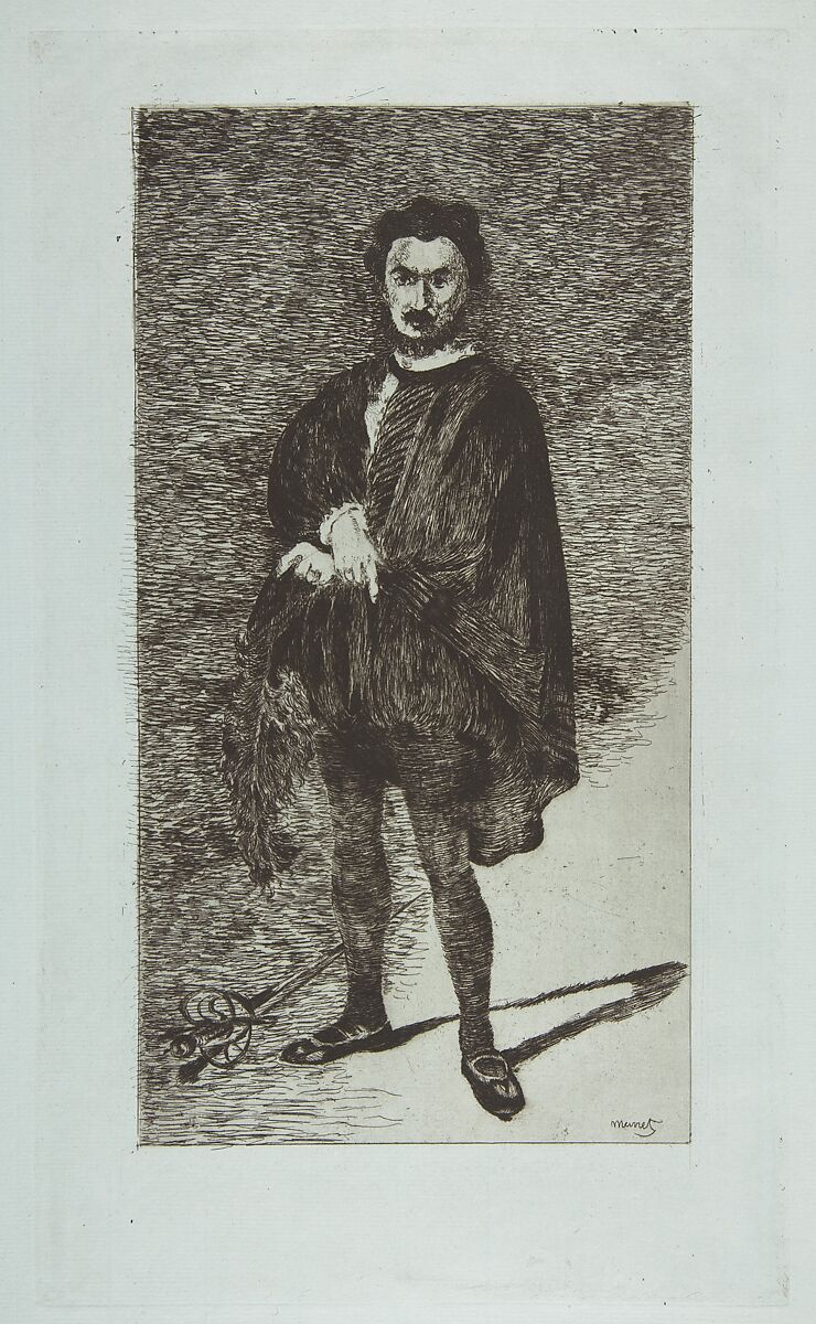 Manet here presents the celebrated French tragedian Philibert Rouvière as Hamlet, feathered hat in hand and sword at his feet, confronting the viewer against a shadowed background of scribbled lines. His distant, mournful expression, suitable for Shakespeare's tragic hero, may also convey the artist's feelings at the actor's recent death. Manet derived the powerful composition from his related oil painting (National Gallery of Art, Washington, D.C.), a work that recalls Velazquez's portrait of the seventeenth-century actor Pablo de Valladolid (Museo del Prado, Madrid).