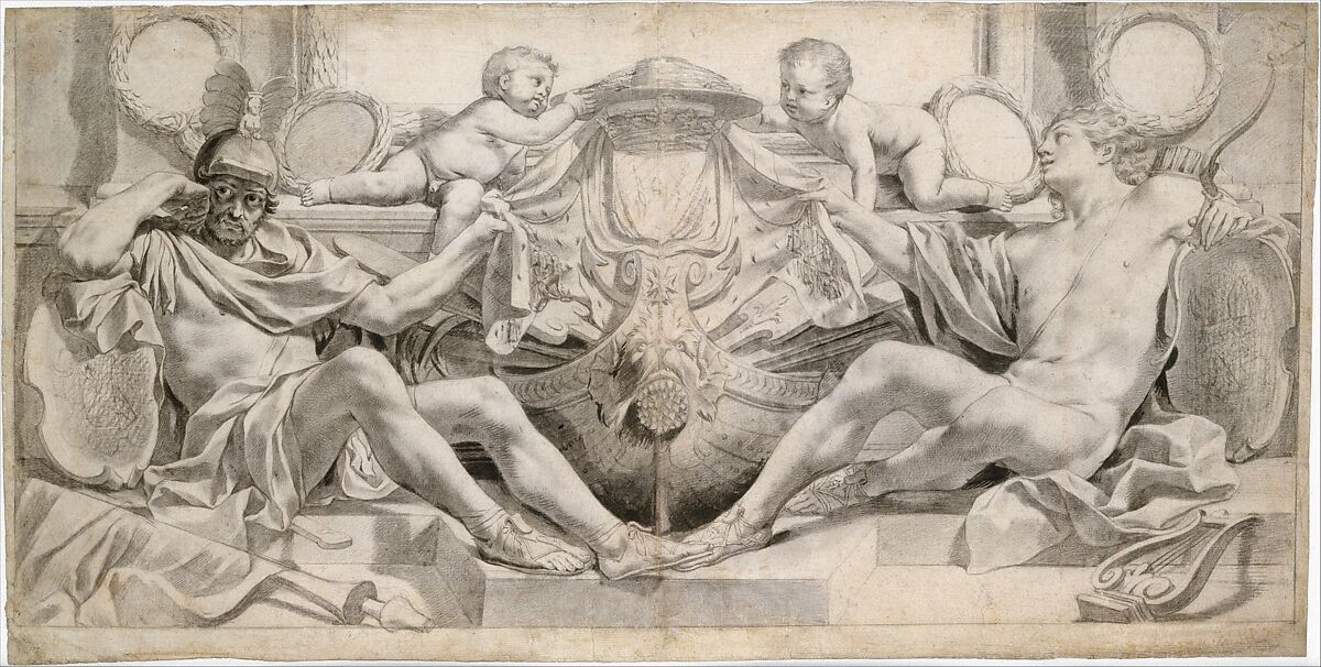 In this allegorical composition, Mars and Apollo, portrayed with their attributes, are seated on either side of a ship’s prow, bearing the mantle of a coat of arms which includes a shield surmounted by a ducal crown, above which a cardinal’s hat is supported by two putti. Empty medallions, framed with wreaths, are hung in the background. The naval attributes refer to Richelieu’s role as High Admiral of France while Mars and Apollo symbolize his eminence in the arts of war and peace. The upper part of the thesis engraving depicts the figure of Fame unveiling cardinal Richelieu seated on his throne, the figure of Religion appears beside him while his wisdom and boldness in directing the war are expressed by the figure of Pallas. For this part, a beautiful study of a flying figure of Fame is preserved at the National Gallery of Canada at Ottawa while a black chalk study representing one of the caryatids is in the Morgan Library in New York. Executed on two attached sheets, this balanced and symmetrical composition is remarkable for its degree of finish and detail but also for the pleasing figural proportions of Mars and Apollo. The handling of the lines and the network of finely worked parallel hatchings that shade and model the figure are particularly refined, a precision made possible by Le Brun’s use of black chalk and the tonal and chromatic possibilities of black and grey washes. By creating in this study strong contrasts, especially in the dark shading just behind the figures, the artist transmitted to the engraver the means to convey the impression of a shallow sculpted relief.