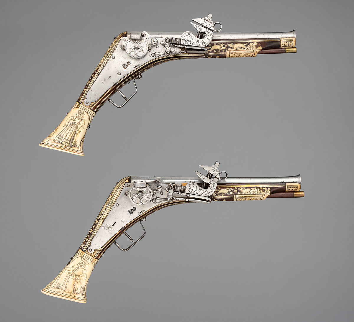 After the wheellock ignition mechanism was devised around 1500, it was first applied to firearms used on horseback. In fact the appearance of pistols––weapons handled with one hand––was due to the invention of the wheellock, and by the middle of the sixteenth century they became part of the equipment of middle and light cavalry, not just weapons available exclusively to men of high rank as had initially been the case. Since an ordinary pistol could deliver only one shot and had to be reloaded to fire the next round, pistols were commonly made in pairs and carried in leather holsters, one on each side of the saddle. A large pommel, often ball-shaped, on the pistol grip made it easier to retrieve from the holster and also helped to conterbalance a heavy barrel.