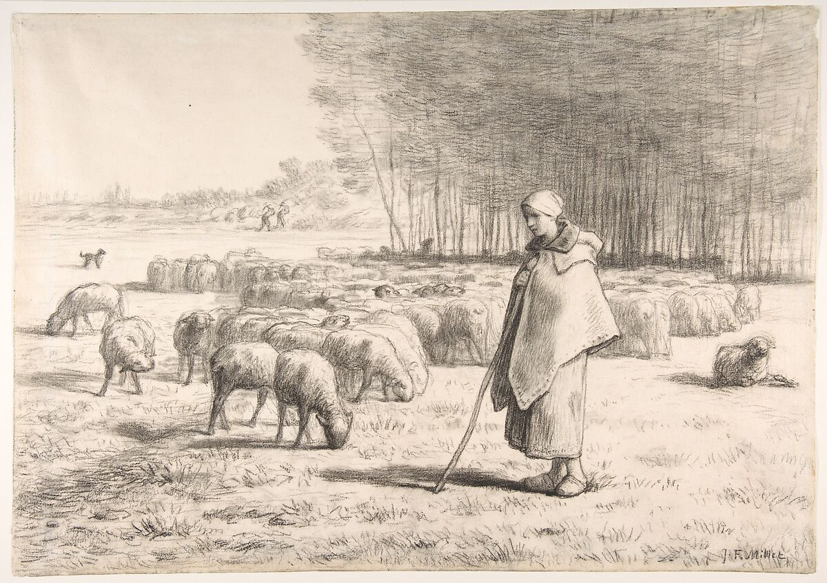 Millet settled in Barbizon, a village outside of Paris, in 1849 and dedicated himself to portraying scenes of rural life. The solitary shepherdess tending to her flock became a popular motif in his drawings and paintings. While Millet’s peaceful representations of the French countryside sought to ennoble the lives of peasants, he also provoked controversy by honestly portraying the hardships of rural poverty. Despite his focus on the timeless figure of the shepherdess, the inclusion of two farmers at work in the distance serves as a reminder of the arduous labor of provincial life.