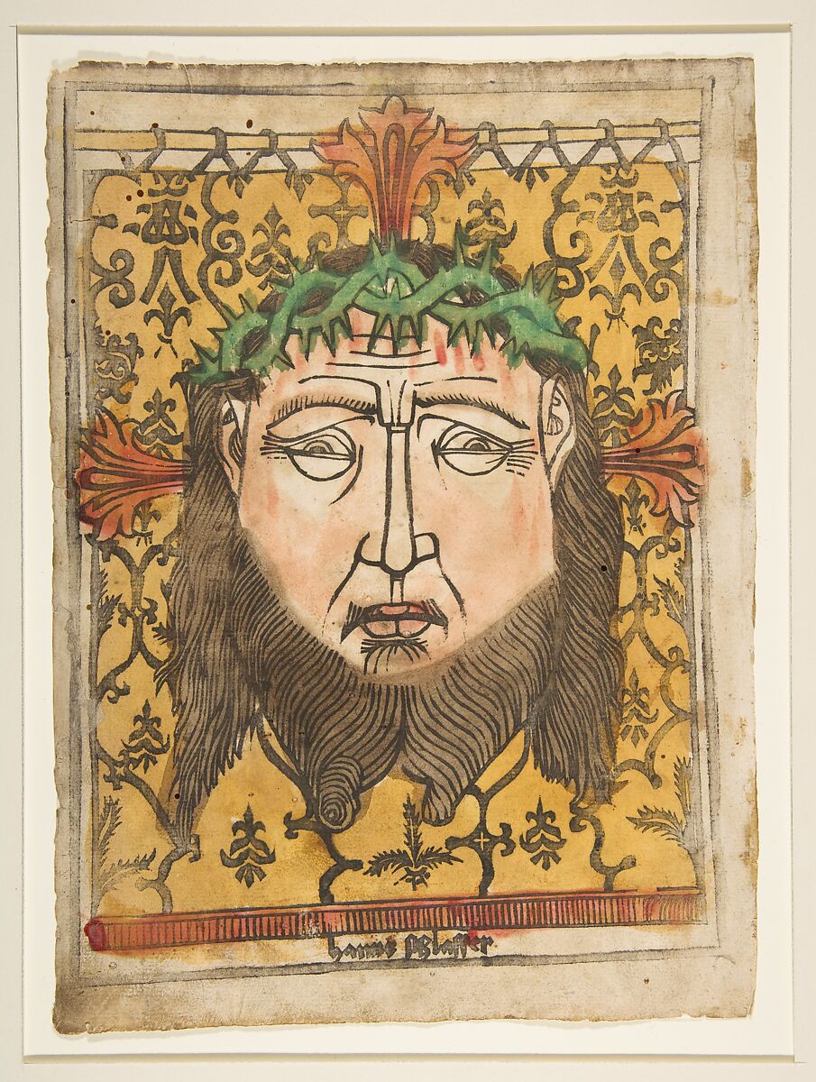 Signed at the lower margin by Hans Schlaffer, a woodcutter and publisher active in Ulm during the last thirty years of the fifteenth century, this is one of the few prints from this period that displays the name of its creator. A true capitalist, Schlaffer (and others) frequently rendered simple versions of existing compositions to fill the popular demand for sacred imagery. For the prototype to this woodcut, Schlaffer copied a finer print, probably created in Nuremberg and now in London's Guildhall Library. The sudarium was believed to have been the only true image of Christ; Saint Veronica offered him her cloth as he struggled under the weight of the cross, and his image miraculously appeared on the fabric as he wiped his face.
