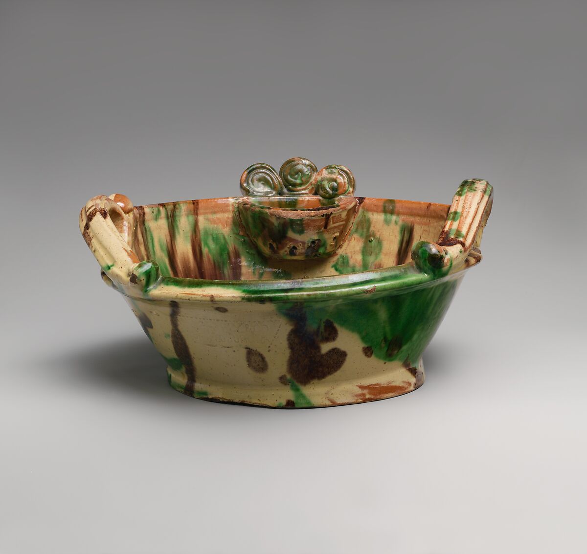 The Eberlys glazed much of their “fancy” ware with the mottled brown-and-green glaze characteristic of late-nineteenth century Shenandoah Valley pottery. The scrolled ornament over the soap dish and the trompe-l’oeil screws that appear to secure the handles further enliven this utilitarian set.