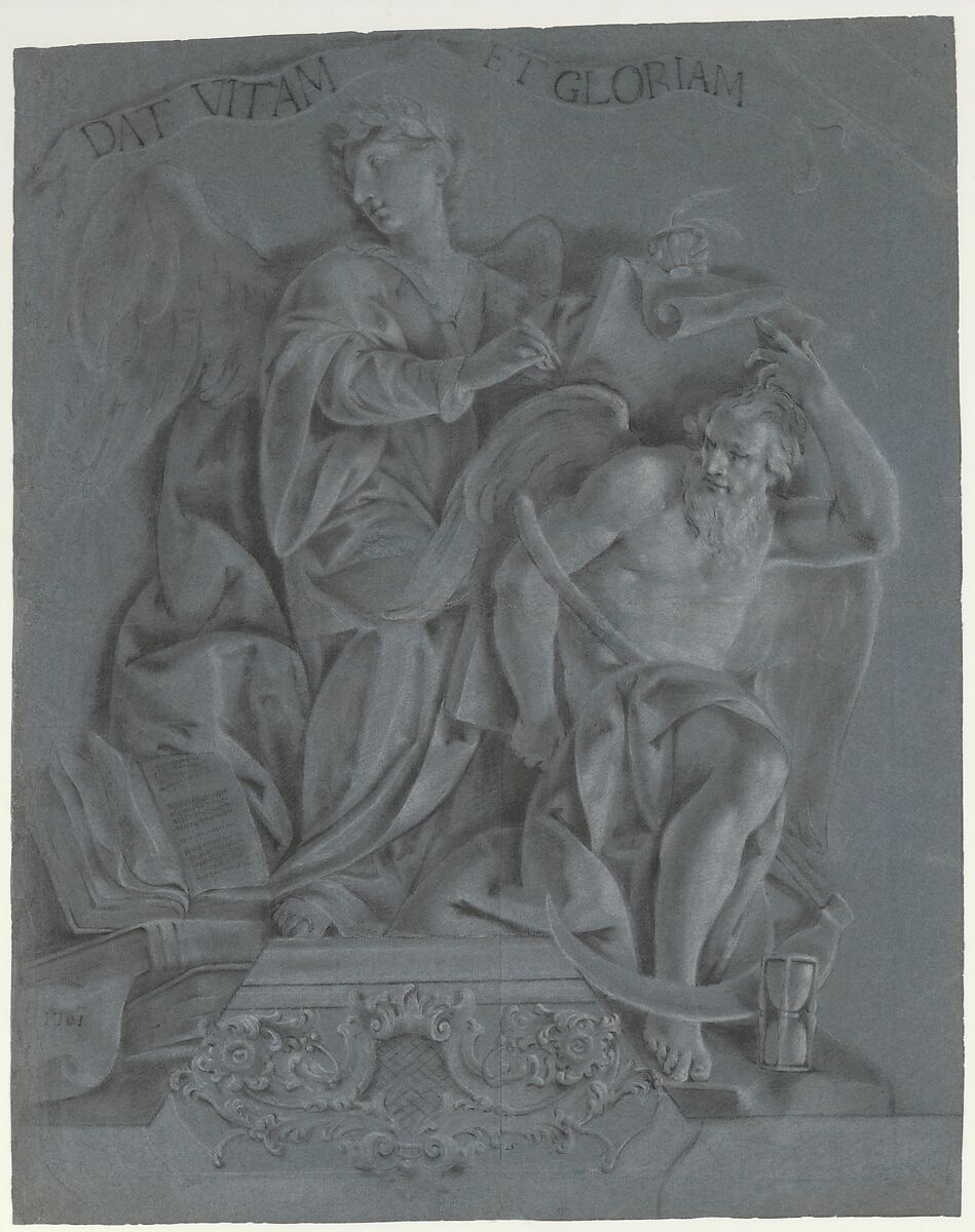 The allegorical figure of the History is represented as a winged figure looking backward as she writes on a tablet supported by Time. In a letter of November 16, 1987, Professor Renato Roli kindly assured the Museum that the old annotation on the verso of the drawing is accurate. Thus, the drawing is a study for one of the allegories painted in chiaroscuro on the walls of a room on the ground floor of the Casa Bovi Tacconi in Bologna, now used as a photographic studio. Most of the wall frescoes have disappeared under layers of whitewash. Only two allegories have survived, although heavily repainted, and Roli points out that in one of these chiaroscuri, facial types and framing motifs are comparable to the Museum's drawing. Bigari's ceiling fresco, representing Apollo crowning a figure of Painting, is intact (Roli 1977, pis. 69a and 69b). A drawing in pen and ink with watercolor for the ceiling fresco and part of its illustionistic architectural framework is in a private collection in Bologna (R. Roli, Settecento Emiliano, 1979, no. 178, fig. 260).