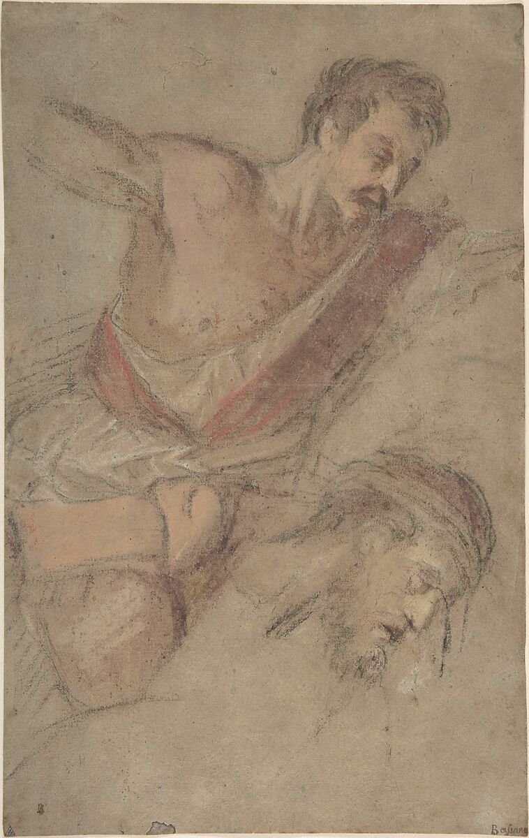 The most innovative Venetian draftsman of the later sixteenth century, Jacopo Bassano was famous for his pastel technique, beautifully exemplified by this drawing executed in black, brown, red, orange-pink and white chalk. It was made in preparation for Bassano's painting of the 'Flagellation of Christ' (Gallerie dell'Accademia, Venice), dated around 1565. The half-dressed man, his face contorting into a brutal grimace, is shown committing the violent act of scourging. More summarily sketched is the head of Christ, facing right.