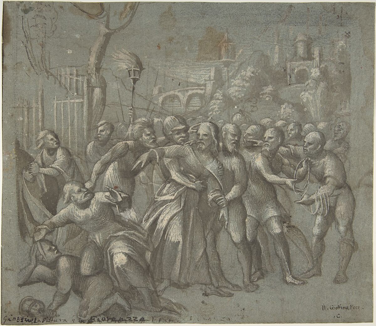 Niccolò Giolfino, a leading artist in the north Italian city of Verona in the 1540s, drew this scene in preparation for his oil painting "The Arrest of Christ" completed in 1546 for the Avanzi Chapel in the church of San Bernardino, Verona. The tumultuous scene depicts the moment following Judas's betrayal with a kiss that identified Christ to the Roman soldiers. Now, barely able to reach his forehead, the bearded Judas is pushed aside by the helmeted soldier who moves Christ toward the waiting rope. As if oblivious to his own capture, Christ turns his attention to Saint Peter, who has struck off the ear of the high priest's slave Malchus. Succinct strokes of white gouache forming Christ's downturned mouth convey his disappointment at Peter's anger. Here and in the other foreground figures, fine lines made with the point of the brush clearly and carefully describe the forms; in the background, by contrast, the landscape is more loosely defined in broad, rapid strokes.