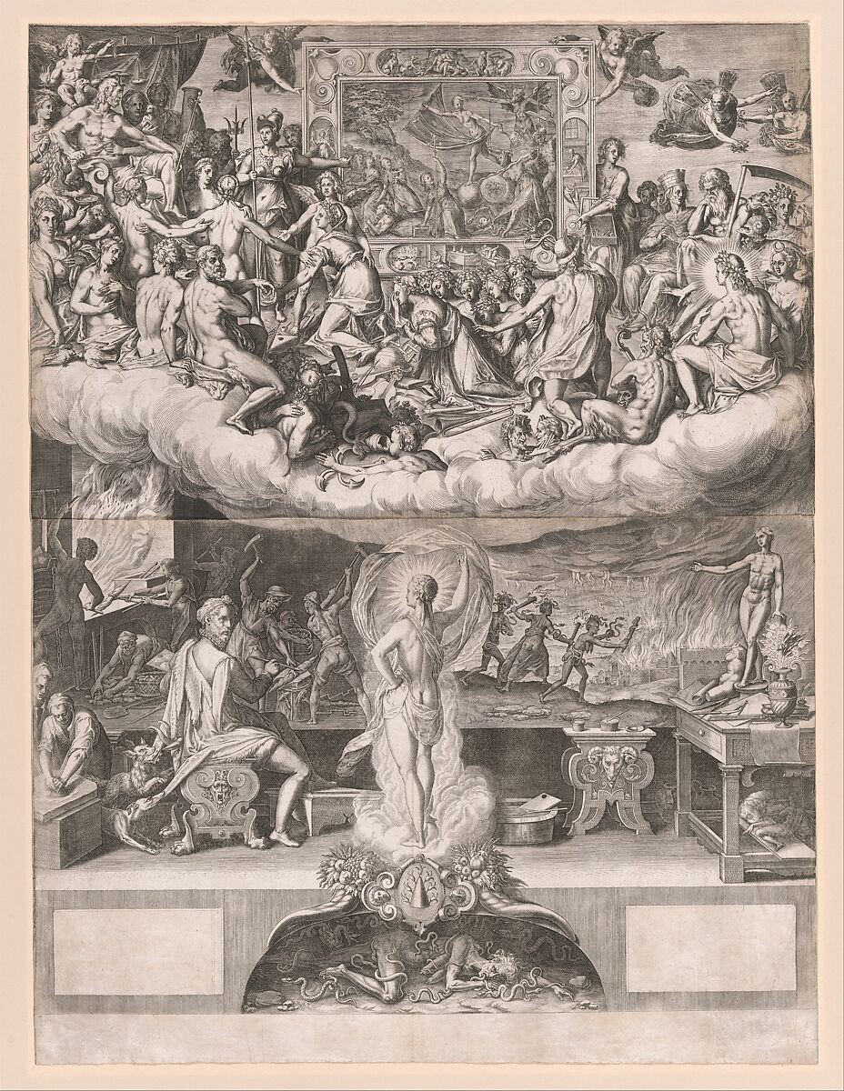 This most ambitious allegory of the art of painting is also a highly personal work: it is generally accepted that the print was prompted by the criticism the Italian painter Federico Zuccaro endured after he finished the decoration of the dome of the Florence Cathedral in 1574. In the upper half of the composition, which had to be printed from two separate plates because of its size, Jupiter is seen in the skies presiding over the assembly of the gods. Before him the three Graces and Amor lead the weeping personification of Painting and the nine Muses. Minerva draws Jupiter's attention to a picture explaining the nature of Painting's complaint: assaulted by Calumny and at the mercy of the vacillating Fortune, the Virtues, which inspire the true artist, are in danger. Jupiter's protection of the threatened arts can be inferred from the section of the painting on which Zuccaro, seen at lower left, is working in his studio-Jupiter's thunderbolt. The artist does not fear the dogs attacking him from behind. He is inspired by a radiant woman representing Wisdom, pointing to the gods and triumphing over Envy, who lies defeated under ground. The allegory is explained in a long poem that usually accompanies the print but is absent in the Museum's impression. This masterpiece of engraving was published in Florence one year after the death of Cort, who worked for more than a decade in Italy.