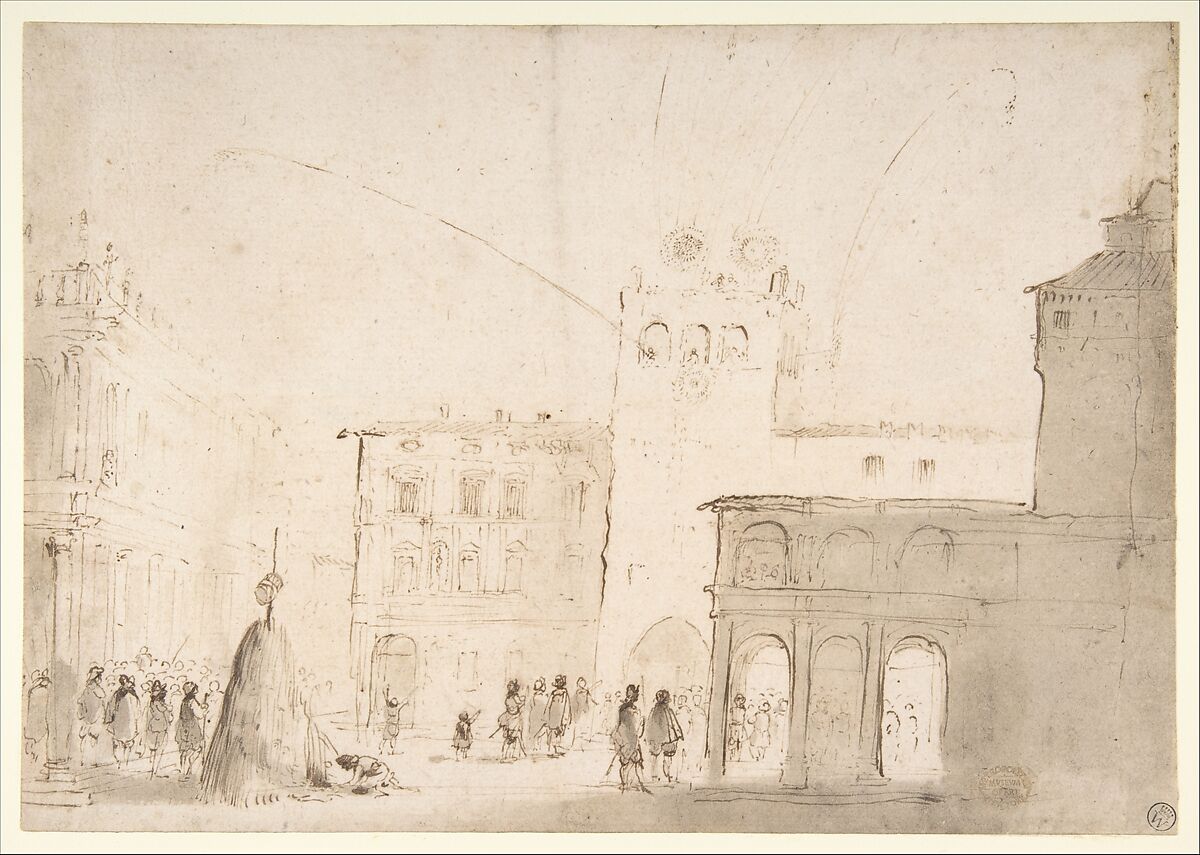 In regards to the location of the piazza featured in the Museum's drawing, Denis Mahon (1968) commented that the architecture is too monumental to be that of the main piazza at Cento and that it also does not represent the Piazza Maggiore at Bologna. Of great interest, Janos Scholz stated in 1945 that the piazza shown in this drawing is the Piazza delle Erbe at Verona (note in departmental file: J. Bean, December 65 LN). Indeed this drawing portrays the Piazza delle Erbe, though not exactly in its current appearance. The palace in the drawing to the left of the bonfire, with its balustrade surmounted by freestanding figural sculptures, resembles the Palazzo Maffei in Verona's Piazza delle Erbe. Another structure from this piazza reflected in the Museum's drawing is the three-storey High Renaissance facade adjacent at a right angle to the Palladian facade. As is documented, Guercino went to Venice in 1618 and to Mantua in 1620. Verona is near to both cities. A structure similar to the Palazzo Maffei is Palladio's Palazzo Chiericati in Vicenza, which, like the palazzo of the Museum's drawing, has rectangular ground-floor bays open to the street and freestanding figural statues along the top of the facade. However, the exact arrangement of buildings in the Museum's drawing are yet unidentified and the drawing is very likely a pastiche of Emilian and Lombard piazze, which offer a similar combination of crenellated gothic rooflines and classicizing Renaissance facades.