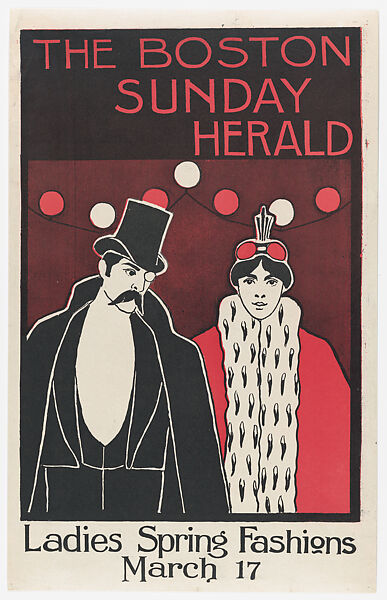 Poster for The Boston Sunday Herald: Ladies Spring Fashions, March 17 [1895], featuring an all-black male suit and top hat, and a red woman's robe, worn with a black and white scarf, possibly made up of or imitating ermin fur, and a matching headpiece of red color with black-and-white feathers.