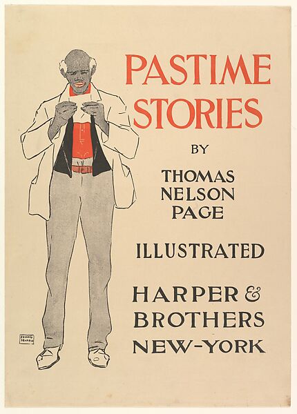 This poster features a caricatural image of an African American man, which echoes the racial misrepresentations found throughout Thomas Nelson Page’s written work. A frequent contributor to Harper’s Magazine, Page popularized a genre of writing that idealized life in the South before the Civil War, creating a revisionist portrait that set the stage for such landmark narratives as Margaret Mitchell’s 1936 novel Gone with the Wind. Page was born at Oakland, one of his family’s plantations in Virginia, and his childhood was interrupted by the brutal Civil War, in which his relatives lost all of their wealth and power. The writer’s nostalgic fantasies—often describing enslaved persons as contentedly working for beloved masters—filled the pages of Harper’s and were frequently published as book collections.