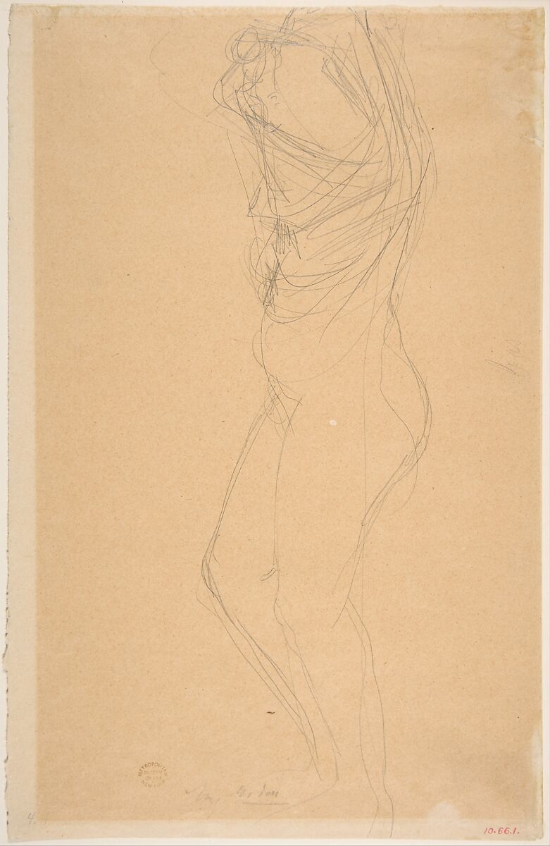From the mid-1890s, Rodin turned his attention to the live model and adopted a new approach to drawing. He became interested in the unconscious movements that his sitters assumed in between traditional poses. The artist tried sketching without looking at the paper in order to keep his gaze fixed on the model. The results contain inevitable distortions and often exceed the bounds of the sheet. Nevertheless, through the simplest graphic means, he captured the dynamism of the body. Here, the concentration of swift graphite marks conveys the gathering pleats of fabric and the upward motion of the model lifting the chemise over her head.