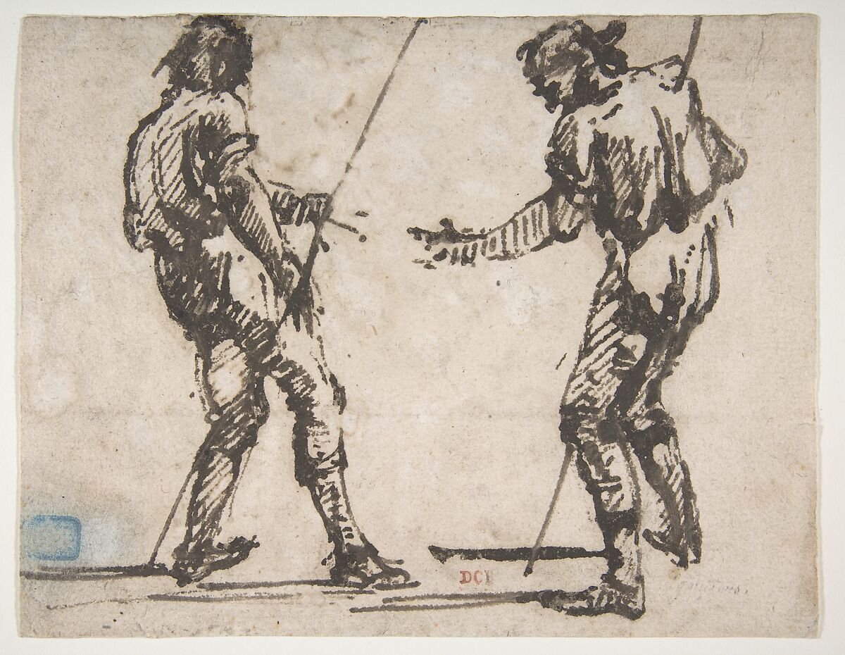 - Title: Two Men Holding Long Staffs (recto); Proof impression of part of an etching, and scribbles in the artist's hand (verso)