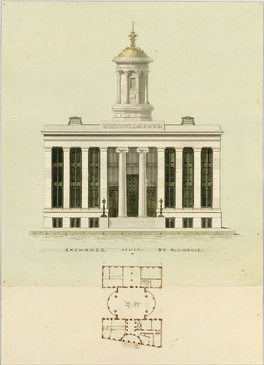 - Title: Façade Design and Old Plan for the First Merchant's Exchange, New York (unexecuted; front elevation and plan)