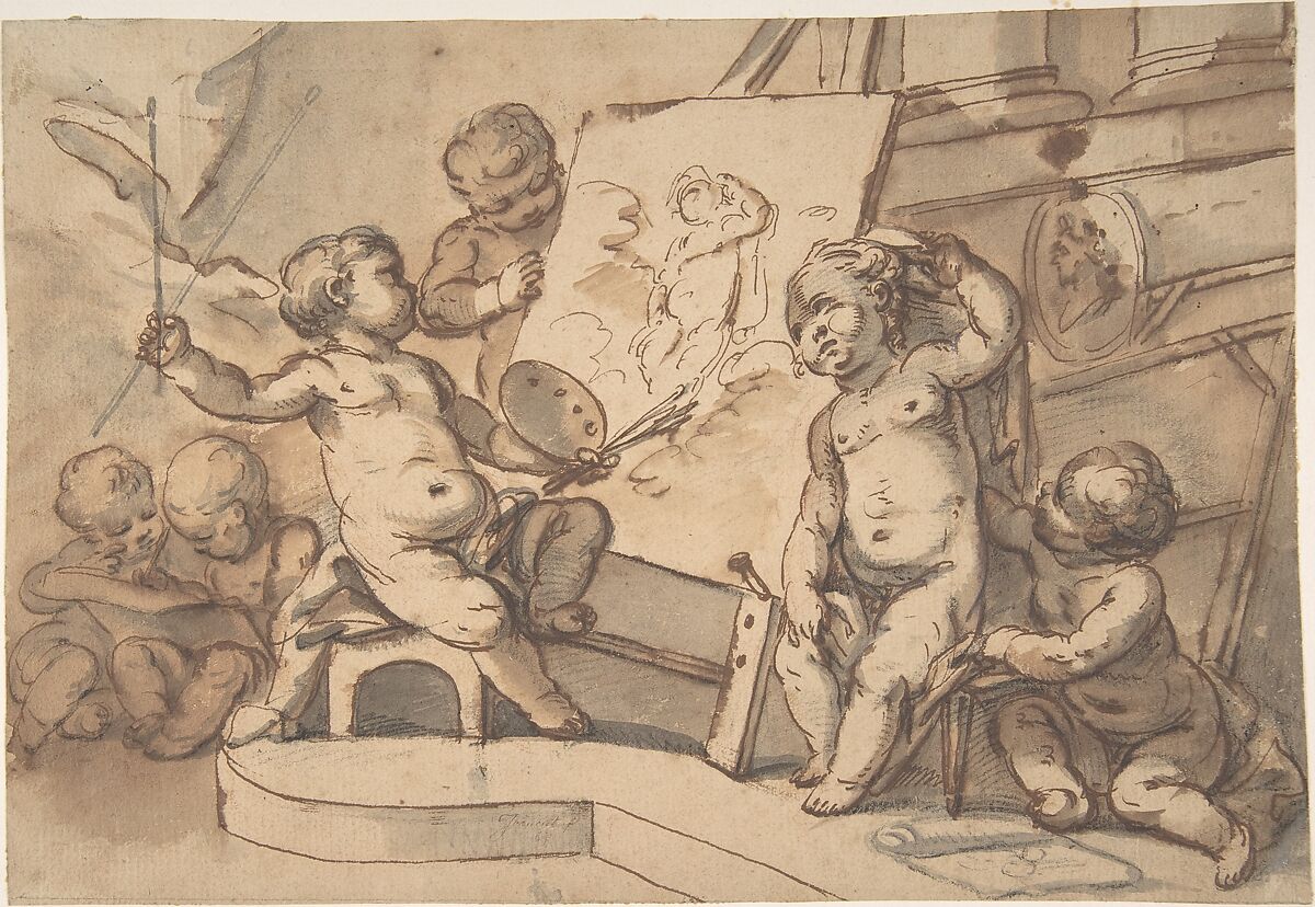 - Medium:Pen and brown ink, brown and gray wash over black chalk; verso: faint black chalk sketches