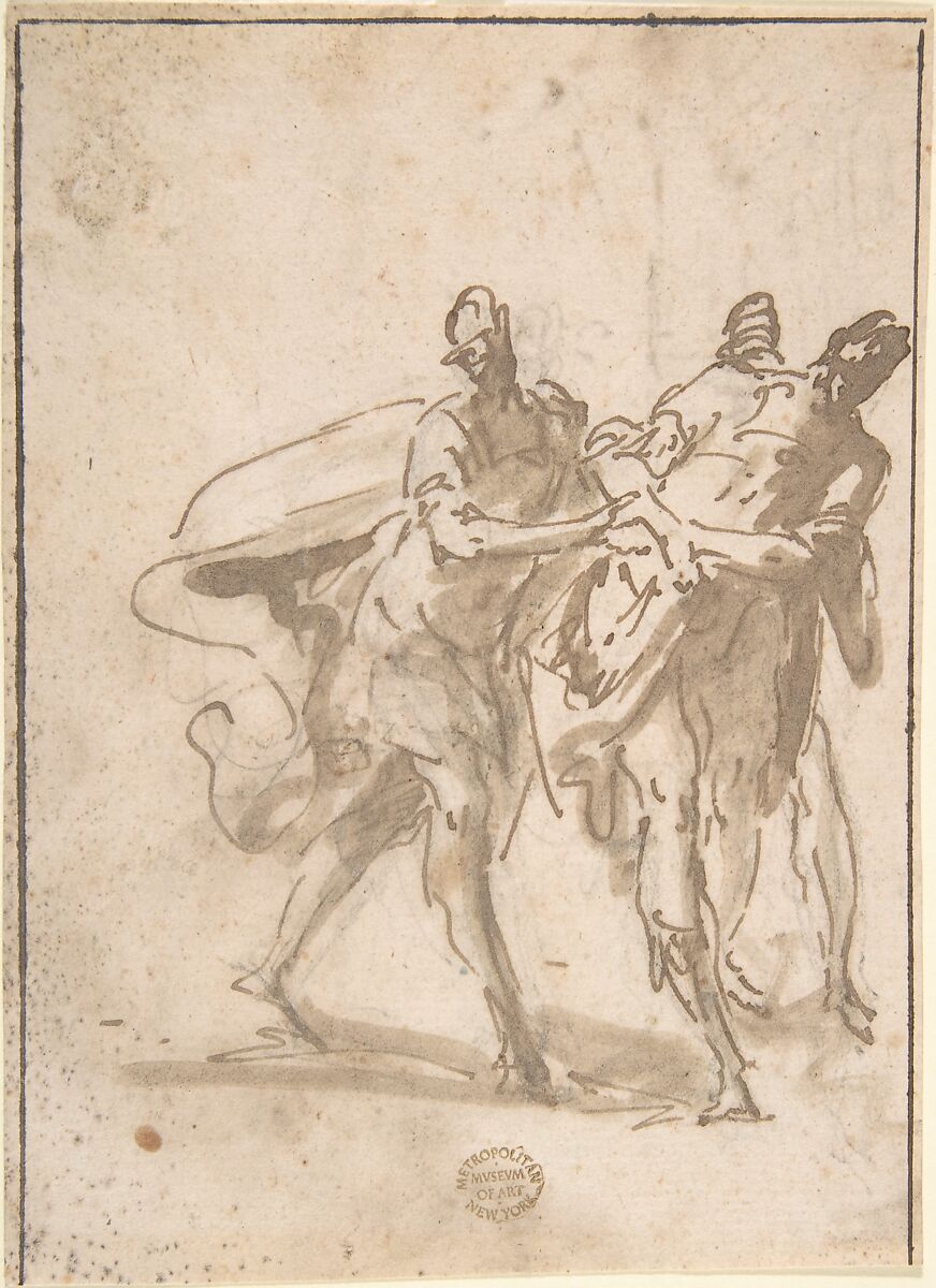 - Medium: Pen and brown ink, brush and brown wash, over black chalk on light brown paper (recto). Ruled framing outlines in pen and brown ink on left, top, and right edges. Black chalk, pen and brown ink (verso)