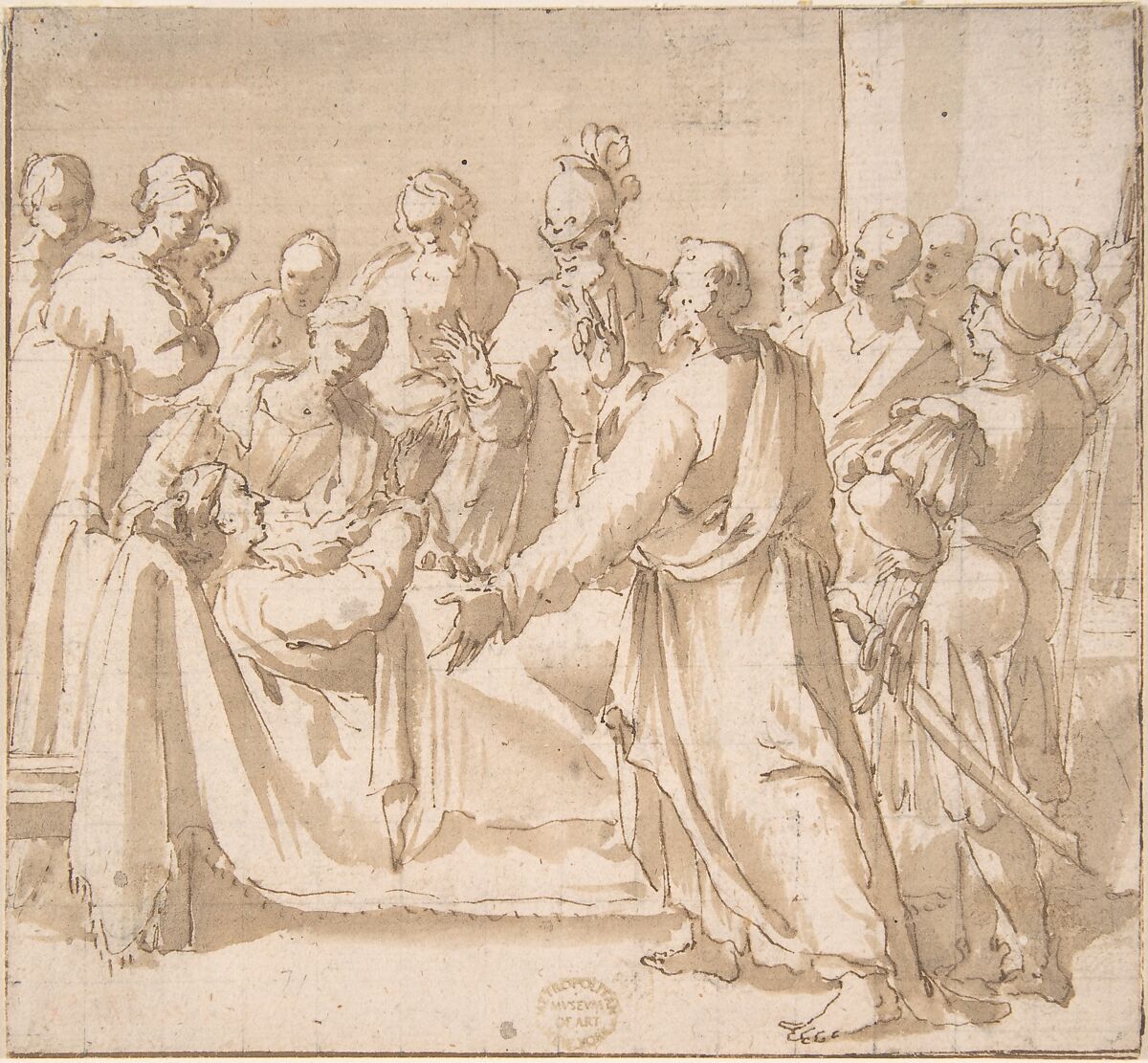 - Medium:Pen and brown ink, brush and brown wash, over traces of black chalk on light tan paper. Squared in black chalk