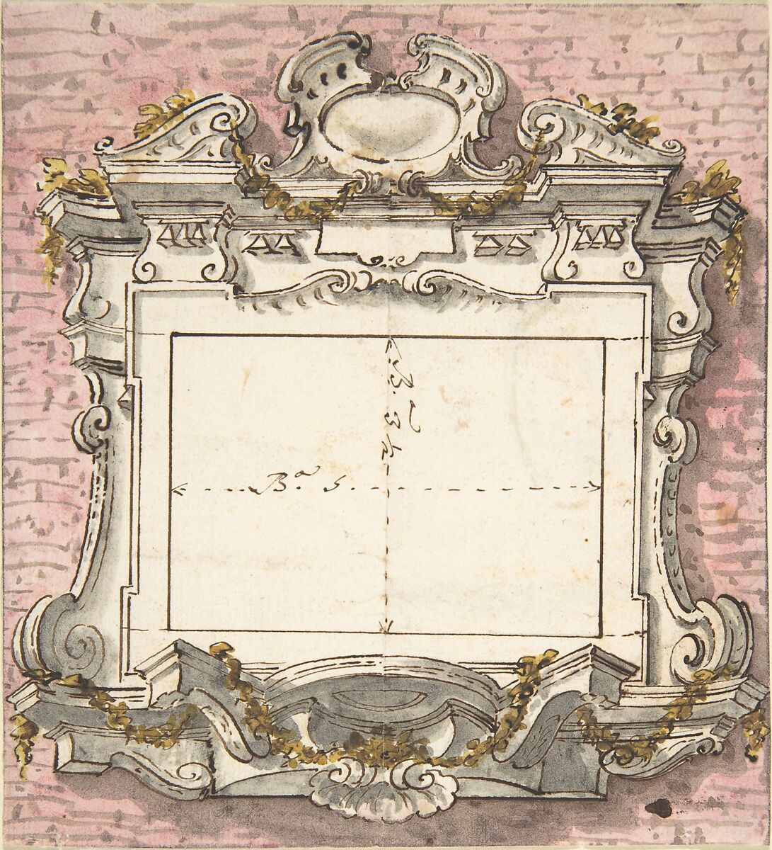 Design for a wall-mounted epitaph or memorial tablet with a rectangular central compartment for an inscription (here left blank). The frame of the epitaph is built up out of architectural elements in high relied, executed in the late Baroque style typical of Northern Italy at the end of the seventeenth and early eighteenth century. It is further decorated with slim garlands of leaves that runs along the top and bottom of the frame. Their yellow tone may indicate it was to be gilded.The epitaph is presented here against a brick wall.