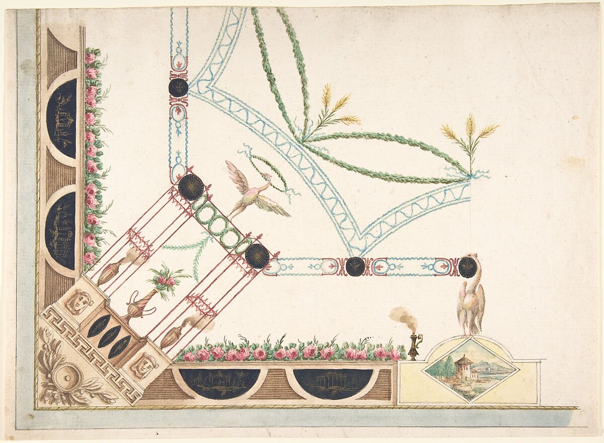 - Medium:Brush and yellow, red, blue, green and brown watercolor, and dark blue gouache, over graphite or lead, on cream paper