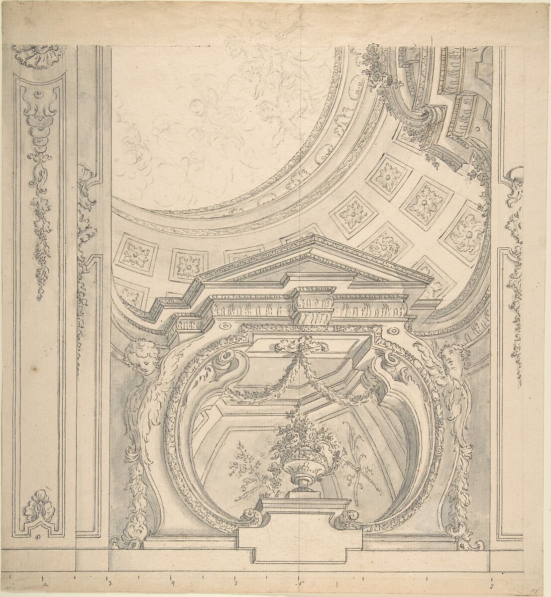 - Medium: Pen and gray and brown ink, brush and gray wash over black chalk underdrawing, with ruled and compass construction in leadpoint; scales at bottom