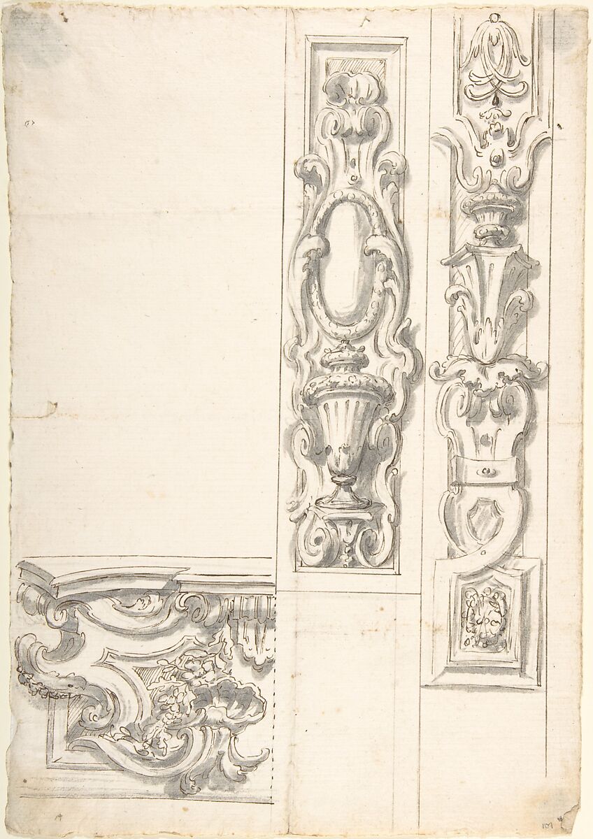 - Title:Design for Two Ornamental Upright Panels, and one Ornamental Basamento (?)