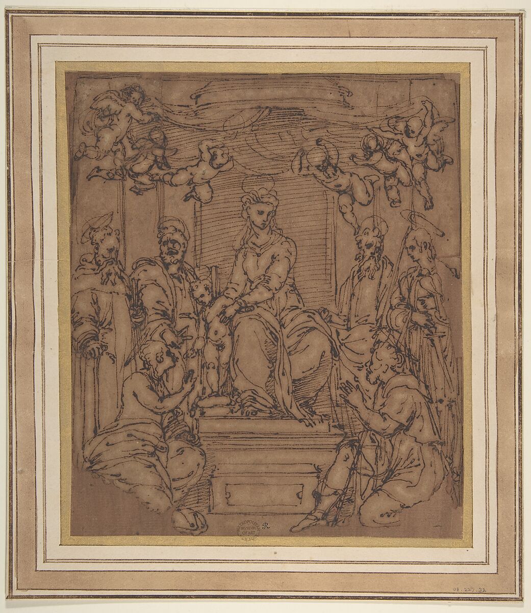 drawing of the enthroned Virgin and Child surrounded by