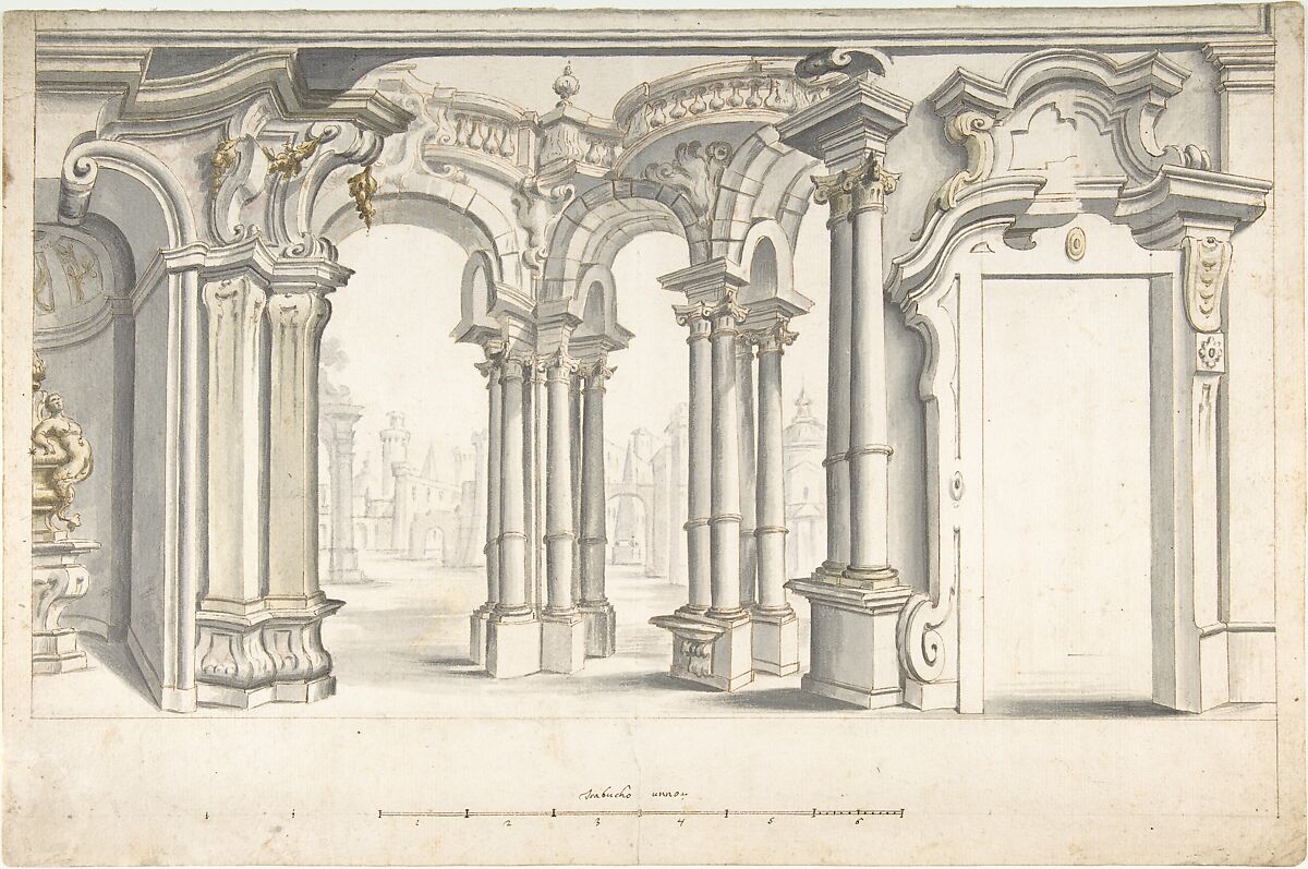- Medium:Pen and brown ink, brush and gray and yellow wash, over black chalk, with ruled construction; measuring scale in pen and brown ink