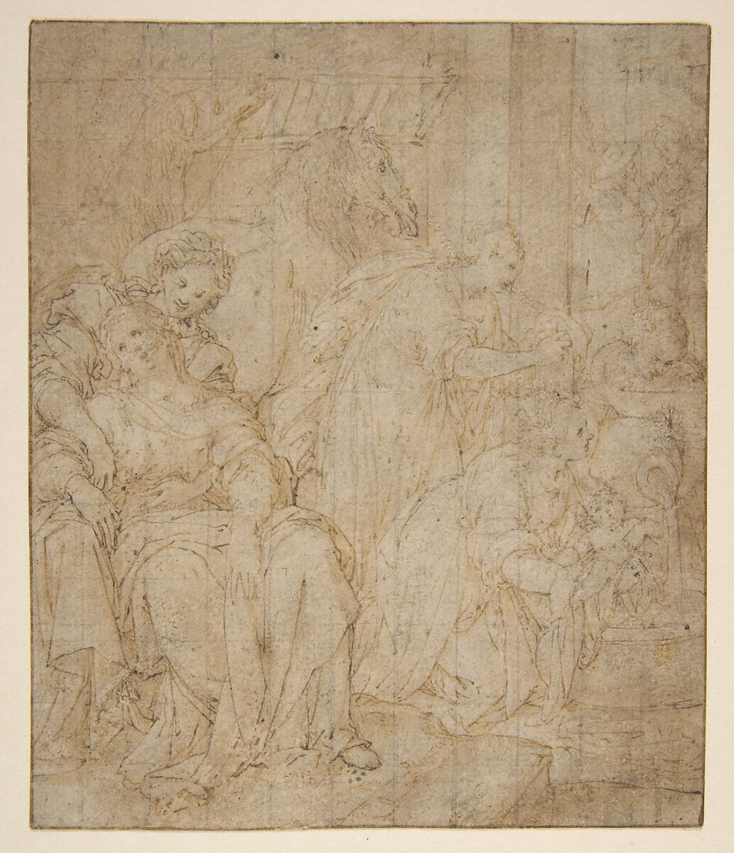 Attributed to Camillo Procaccini by Jacob Bean, the rare subject of this drawing with ‘The Birth of Saint Francis’ has been identified by Nancy Ward Neilson (1979): Francis's mother, a lady of high station, wished to give birth to her first child in the stable of the family house in recollection of the humble birthplace of Jesus. In the background is visible the mysterious pilgrim visitor who, according to the Franciscan legend, announced the saintly vocation of the newborn son. Another Lombard representation of this story is a painting by Giovanni Mauro della Rovere (1575-1640), now in the Prepositurale di Saint Marco, Milan (see: Dipinti della Pinacoteca di Brera in deposito nelle chiese della Lombardia, 1, Milan 1969, p. 42, fig. 19). A copy of this drawing is in the Staatsgalerie, Stuttgart.