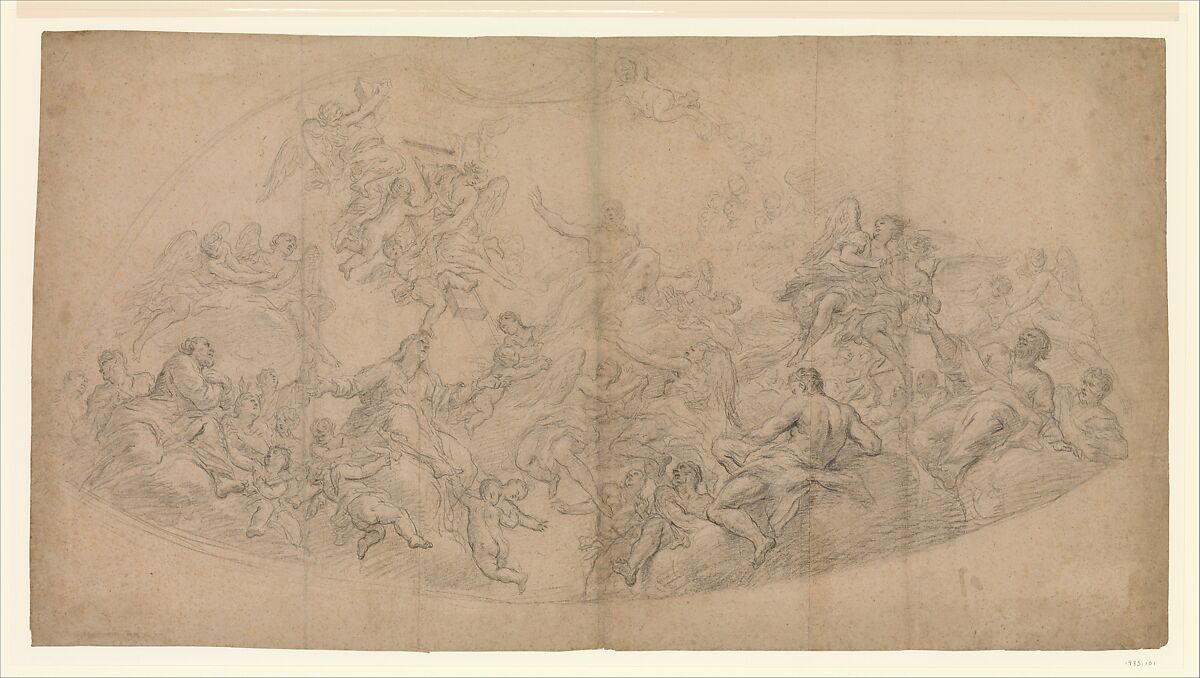 At the center of the composition Christ in glory points to the Holy Cross supported by angels. In the foreground are seated, among angels and putti, Saint Peter, the Blessed Virgin, Eve, Adam, Saint John the Baptist, and another Apostle, probably Saint Paul. The old annotation on the reverse of the sheet correctly identifies the purpose of the drawing: it is a study for the central section of the frescoed cupola in the chapel dedicated to the Holy Cross and the Passion of Christ, the second on the right in Saint Frediano in Cestello, Florence. This chapel was endowed in 1700. See nos. 1987.288 and 1987.307 for other drawings by Antonio Franchi (il Lucchese) related to San Frediano in Cestello.