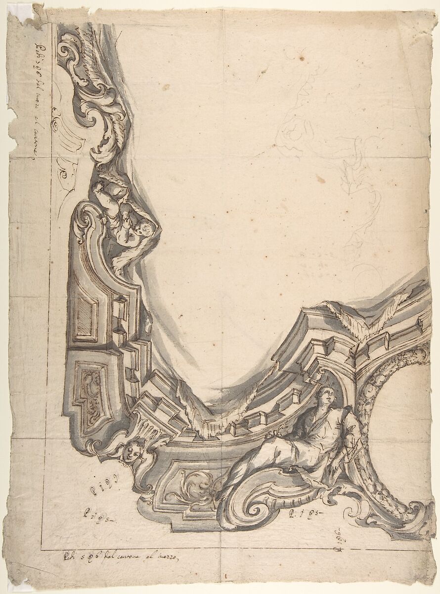 - Title: Design for a corner of a Painted Ceiling, Architectural "Cove" with a Seated Figure at the Bottom, and a Putto at the Side
