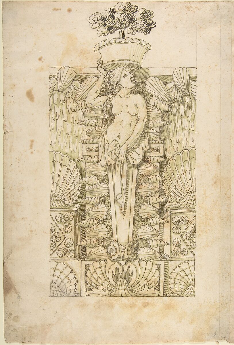 - Medium: Pen and brown ink, brush and green wash, over leadpoint or graphite with ruled construction; framing lines in leadpoint or graphite