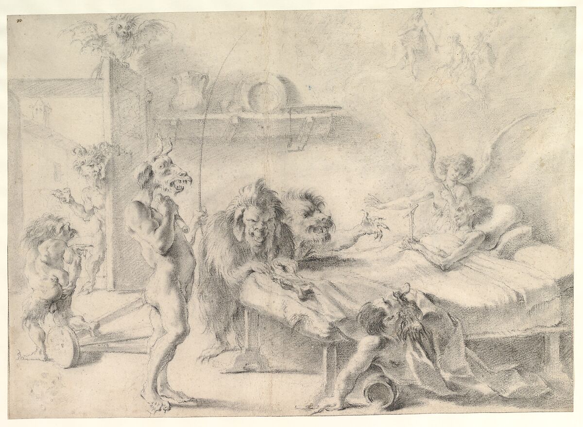 - Title: An Old Man on His Deathbed Tempted by Demons (recto); Back View of a Male Nude (verso)