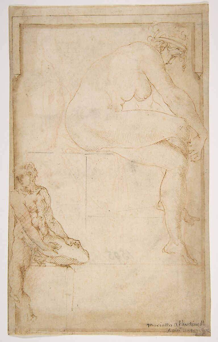 - Title: Two Figures in an Architectural Setting: A Female Nude Seated in a Profile View and a Seated Male Nude in a Three-Quarter View with the Left Leg Bent