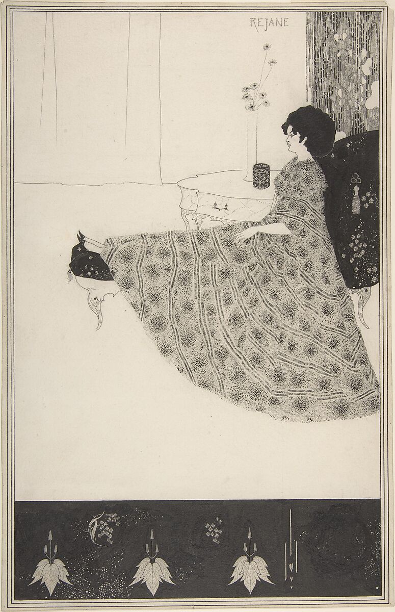Beardsley's drawing centers on Gabrielle Réjane, a successful French acress whose London debut as Catherine in "Madame Sans Gêne" took place at the Gaiety Theatre on June 24, 1894. The artist imagines her resting on a chaise-longue and uses a filmy sweep of skirt to define the form, with deep black japoniste upholstery supporting the actress's back and feet. A strong visual contrast is established between the expanse of white paper at left, containing a few minimalist lines that describe furniture, and a dark border below which is filled is flowers but is reminiscent of the edge of a stage.