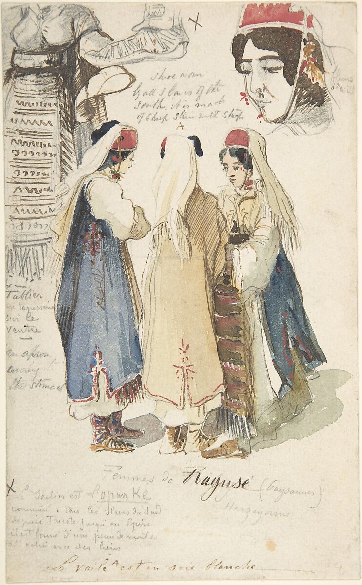 Lear was a tireless traveller and prolific draftsman who visited Dalmatia and northern Greece many times. Here, he records the traditional slavic dress of women gathered to talk, noting that their distinctive shoes are called "L'Opanke" (Opanak). Ragusa (today Dubrovnik, Croatia), is a port city on the Dalmatian coast controlled by Venice until 1797. After Napoleon's fall it became part of the Austrian empire until 1918.