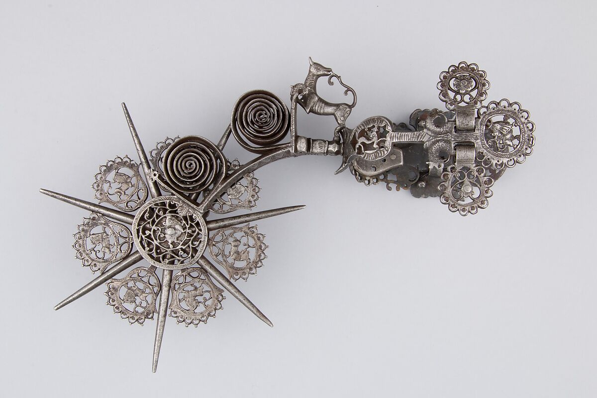 These incredible spurs are adorned on the heel band and between the spikes of the rowel with delicate pierced decoration featuring lions walking among vegetal scrolls. Each terminal, featuring buttons for the straps, is shaped as a double-headed eagle, originally the German imperial emblem, a motif imported from Spain and used here only for a decorative purpose. Each neck is adorned with spirals and a figure of a dog (or a stylized lion) in the round, standing on a plaque bearing the signature of the maker, Manuel Casco, and the date. Other letters and monograms are inscribed on the dogs, possibly the marks of two of Casco’s collaborators.