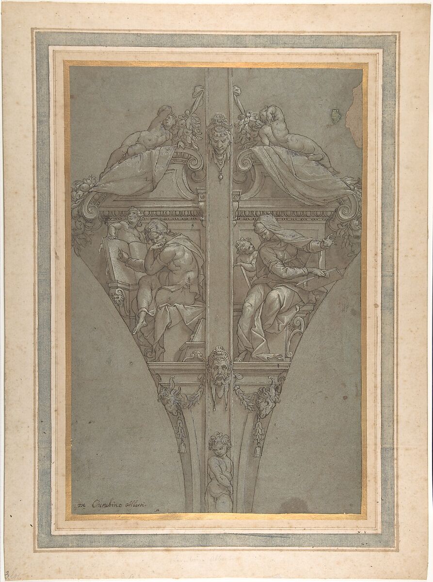 The iconography and style of this refined and polished design find their principal inspiration in Michelangelo's frescoes in the Sistine Ceiling (1508-12), with its alternating monumental figures of sibyls and prophets in a variety of complicated poses. At the same time, the compressed, decorative arrangement of the figures and the crisp, ornamental line are closer to some of the designs of Francesco Salviati, and the Zuccari, artists who were working on the decoration of the Sala Regia in the Vatican Palace at the same time as Samacchini. For these stylistic features, the drawing was previously attributed to Cherubino Alberti.