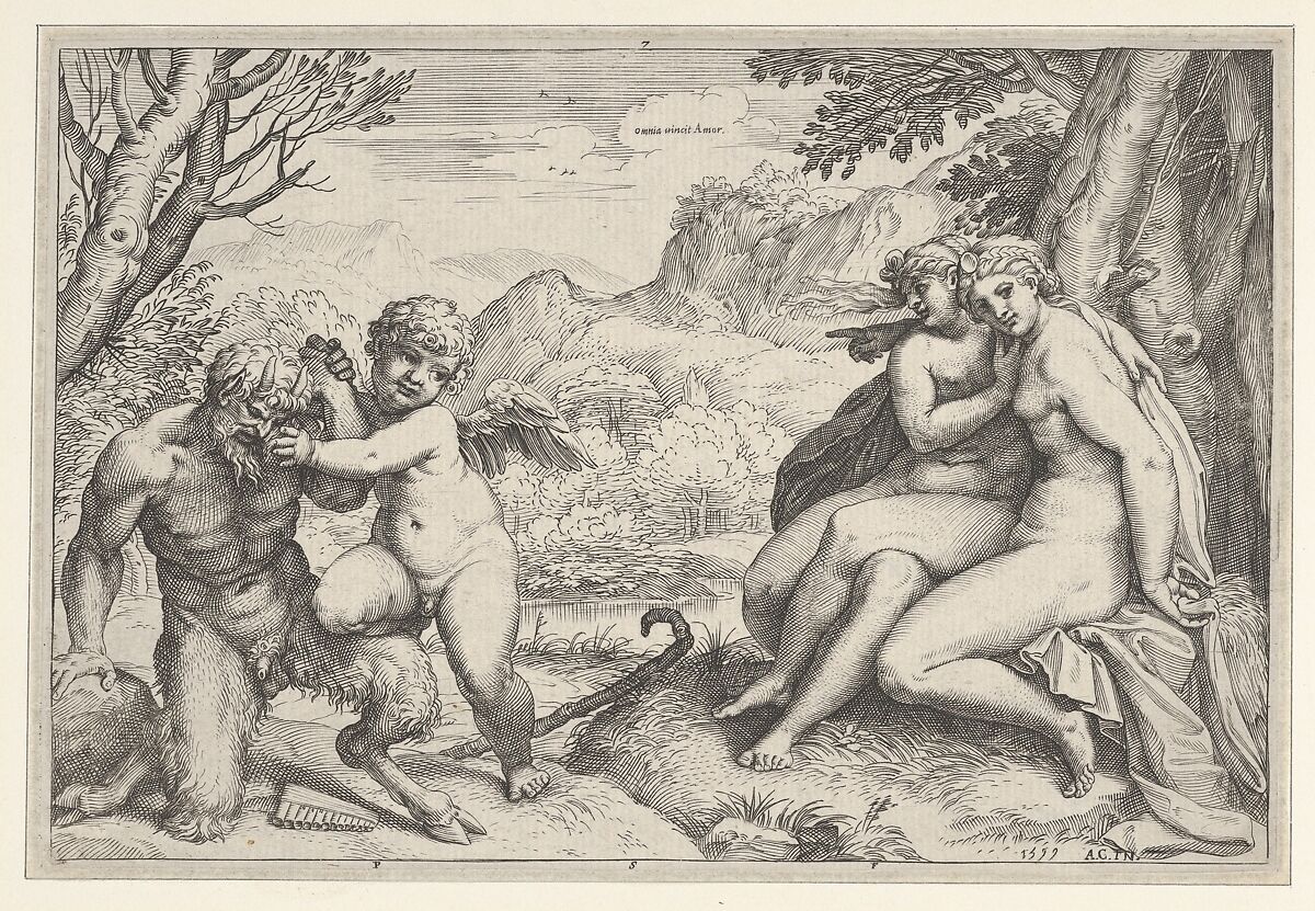 This image is a pun derived on a famous line in Virgil's tenth Eclogue, 'Love conquers all.' The Latin word omnia, like the Greek word pan, signifies 'all', while amor, the Latin name for Cupid, means 'love', so that Cupid's victorious combat with the woodland god is a visual translation of the phrase. The engraving was produced around the time that Agostino was assisting his brother Annibale in the decoration of the Farnese Gallery, a fresco cycle that also has as its theme the power of love in the universe. As a key to this meaning, Annibale had painted Cupid's successful wrestling match with Pan on one of the feigned medallions that adorn the Farnese ceiling. The subject was not a new one; it had been part of the fresco decoration of Cardinal Bibbiena's stufetta already in 1516, and had also appeared in sixteenth-century emblem books. Agostino himself had painted the battle between Pan and Cupid nearly a decade earlier in the Palazzo Magnani in Bologna.
