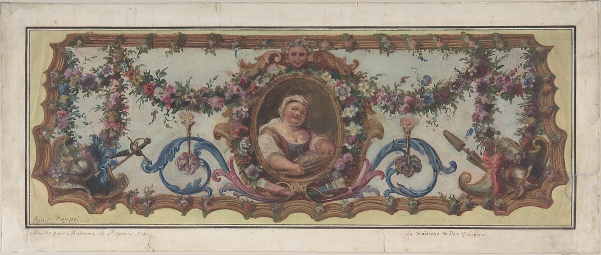 The painter Charles Antoine Coypel was also a noteworthy designer for the famous Gobelins tapestry manufactory in Paris. His most successful tapestry series illustrates the story of Don Quixote, based on the seventeenth-century novel by Miguel de Cervantes. Conceived in 1714, the series remained in production until 1794. This design for the seat of a sofa dates from 1721 and depicts Don Quixote’s mistress in a detail taken from a larger tapestry composition. According to the inscription, the design was conceived for "Madame la Regente," most likely referring to Françoise Marie de Bourbon, the spouse of Prince Regent Philippe d’Orléans. The sofa was probably part of a full set for a salon, but none of the other designs by Coypel survive.