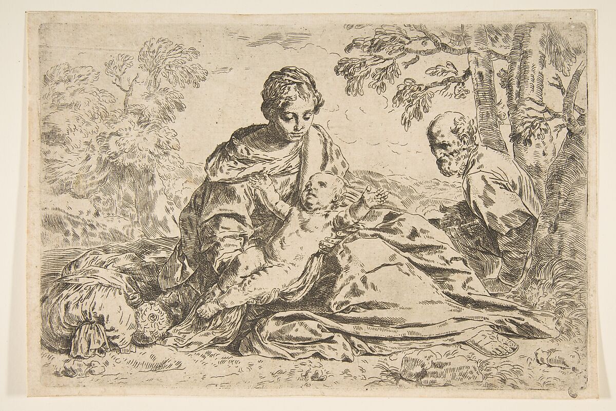 - Title:Rest on the flight into Egypt, Mary holding the infant Christ with St. Joseph at right, copy after Cantarini