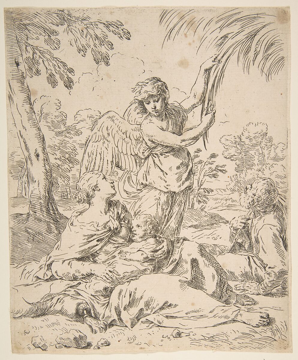 - Title: Repose in Egypt, Mary nursing the infant Christ while an angel pulls at tree branches