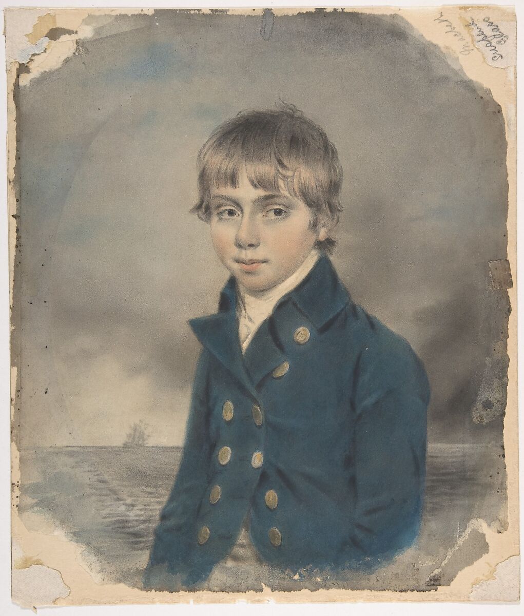The young subject’s blue jacket in this work identifies him as a sailor in the Royal Navy, a distant ship signaling his imminent departure from home. Downman’s success as a Regency-era portraitist resulted from a technique he devised that combined chalks and watercolor, enabling him to capture appealing likenesses and make multiple copies of these portraits if required. He received commissions from the royal family and nobility, but it was his many drawings for middle-class patrons that encouraged a growing contemporary taste for intimate, domestic-scale portraiture. Born in Wales, Downman studied in Liverpool and London, traveled to Italy, and then worked in Cambridge, Plymouth, Chester, and Wrexham. This drawing was part of a bequest to the Met from Brooklyn-born George Dupont Pratt, a noted philanthropist, collector, and Met trustee.