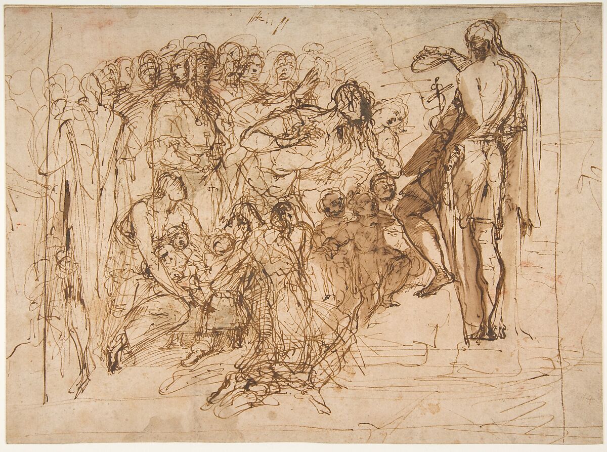 The drawing is a study for the lower half of a fresco on the left wall of the Poggi Chapel, representing ‘Saint John The Baptist Baptizing the Multitudes’ (San Giacomo Maggiore, Bologna), and probably dating between 1554 and 1556. The energetic tangle of lines of this drawing recalls the style of Taddeo Zuccaro, who, like Tibaldi, was active in Rome in the 1540s and 1550s. Like Tibaldi's imaginative frescoes for the Palazzo Poggi (for which see also the preparatory study for the figure of Aeolus in the Museum’s collection: acc. no. 2007.127), the frescoes in the Poggi chapel had considerable influence on such Bolognese artists as Samacchini and Passarotti. Moreover, when Lodovico, Agostino, and Annibale Carracci founded their famous academy in Bologna - in which they sought to reform painting through a renewed study of nature combined with a study of the best artworks - the Poggi Chapel was among the models they recommended to their students.