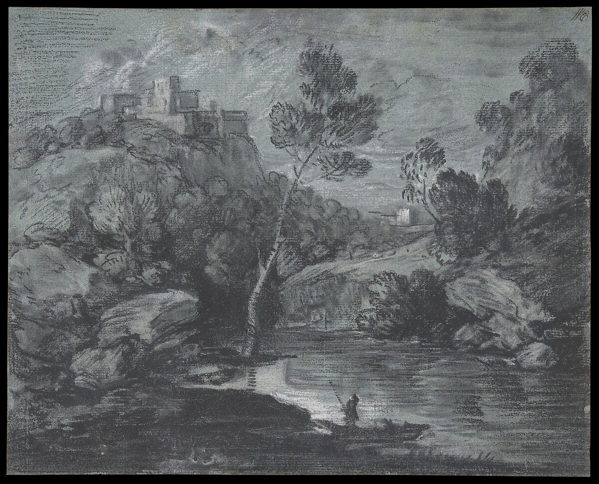 Once thought to date to the mid-1770s, when Gainsborough moved to London from Bath, the handling of this sheet suggests a date following the artist's visit to the Lake District in 1783. His early drawings respond to the English landscape, but this composition is an imagined conflation that demonstrates admiration for Claude Lorrain and Gaspard Dughet conveyed using black and white chalks on blue paper, a seventeenth-century technique. The appreciation for rough, irregular forms accords with the contemporary British aesthetic of the Picturesque.