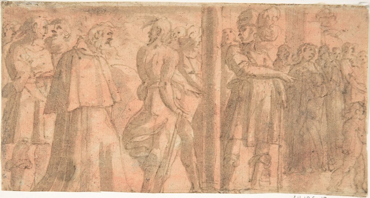 - Medium:Pen and brown ink, brush and brown wash on red washed paper