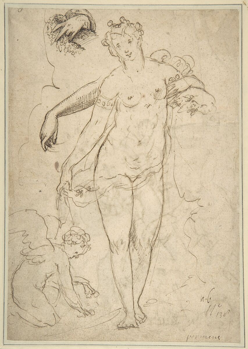 - Title:Standing Nude Female and Putto with Studies of a Hand and an Arm (recto); Satyrs destroying a Female Herm (verso)