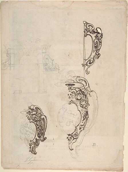 - Title: Designs for Cartouches, Containing Arms of Cardinal Aldobrandini (Later Pope Clement VIII), with Arch in Upper Left (recto); engraving by Enea Vico, urn with lion heads and garlands (verso)
