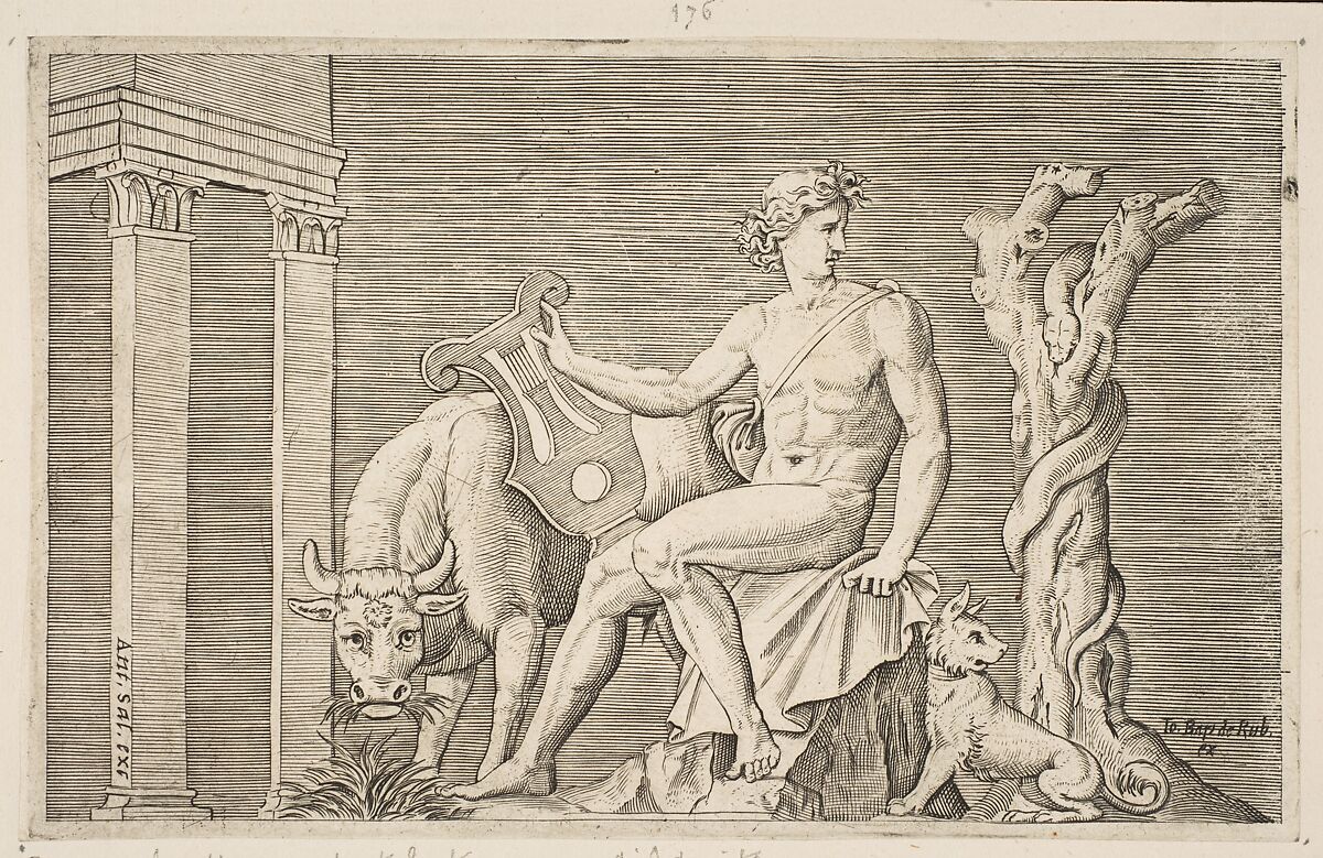 - Title: Apollo tending the flocks of Admetus, Apollo seated holding a lyre and flanked by a cow and a dog, a serpent winding around a dead tree at right