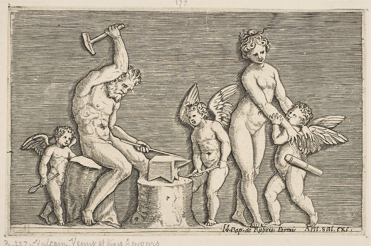 - Title:Vulcan seated hammering on an anvil flanked by Venus and three cupids