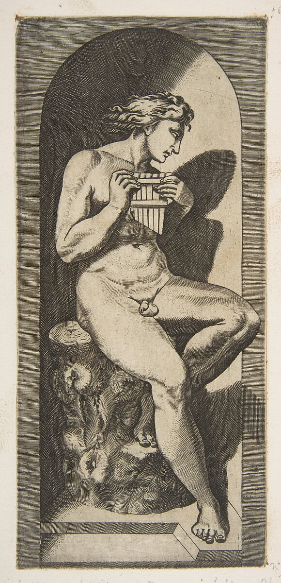 - Title:Olympus naked seated on a tree stump holding pipes, set within a niche